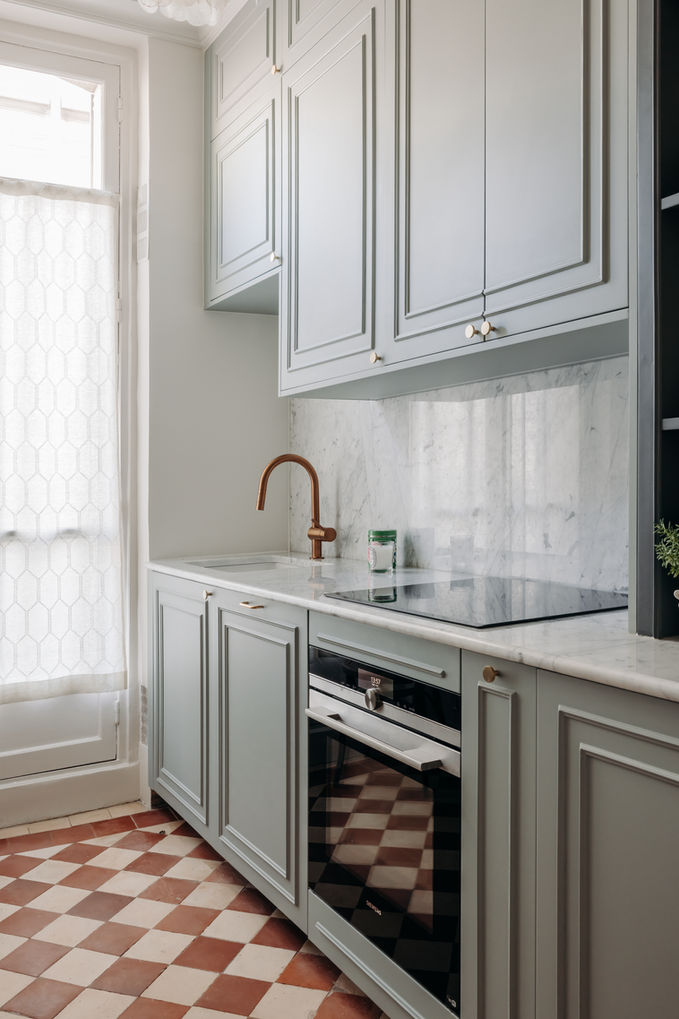 Dans cet appartement parisien de style bourgeois haussmannien, nous sommes intervenues en tant qu’architecte d’intérieur dans le cadre de la rénovation complète du bien. L’idée était de mettre en valeur son charme d’origine tout en l’adaptant aux besoins et au style de ses nouveaux propriétaires. L’idée en lien avec l’architecture de l’appartement et les goûts de nos clients était de revisiter des design très classiques pour s’intégrer parfaitement dans le style d’origine du lieu. Mais ce classicisme qui préserve le charme intemporel de l’appartement est twistée par l’usage de la couleur et des éléments de décoration beaucoup plus design et contemporains. Les époques se répondent et s’harmonisent parfaitement pour créer une intérieur unique, tant classique que contemporain. L’organisation des espaces tourne autour de cette grande verrière centrale créée entre l’entrée et le salon permettant de faire passer la lumière et la sensation d’espace dans tout le bien. Une attention particulière a été apportée à la conservation et la mise en valeur des éléments d’origine comme les carreaux de ciment, les habillages muraux et les corniches. Les radiateurs ont également tous été chinés et viennent parfaire l’authenticité et le standing du bien exceptionnellement placé sur l’Ile Saint Louis avec vue sur la cathédrale Notre Dame de Paris. Toutes les pièces ont été dessinées et pensées intégralement par notre atelier, de la cuisine à la salle de bain, en passant par le dressing et le bureau.